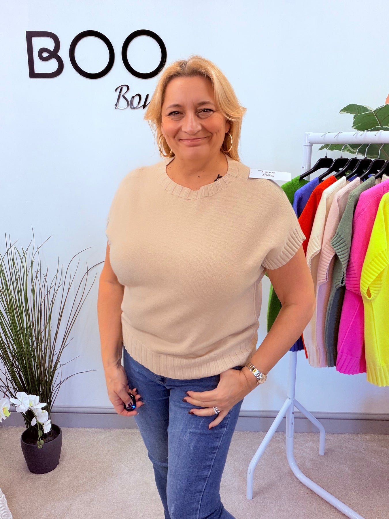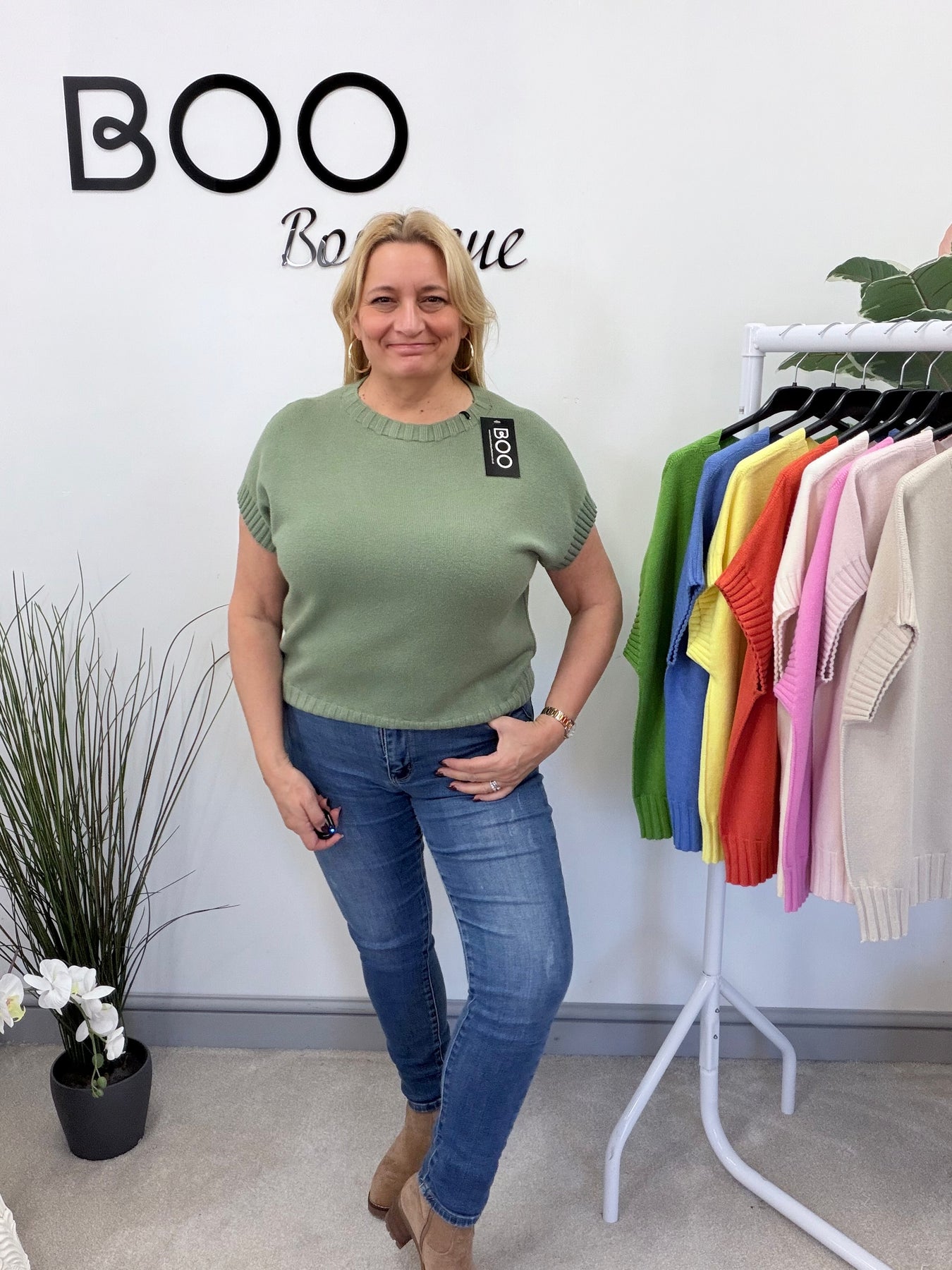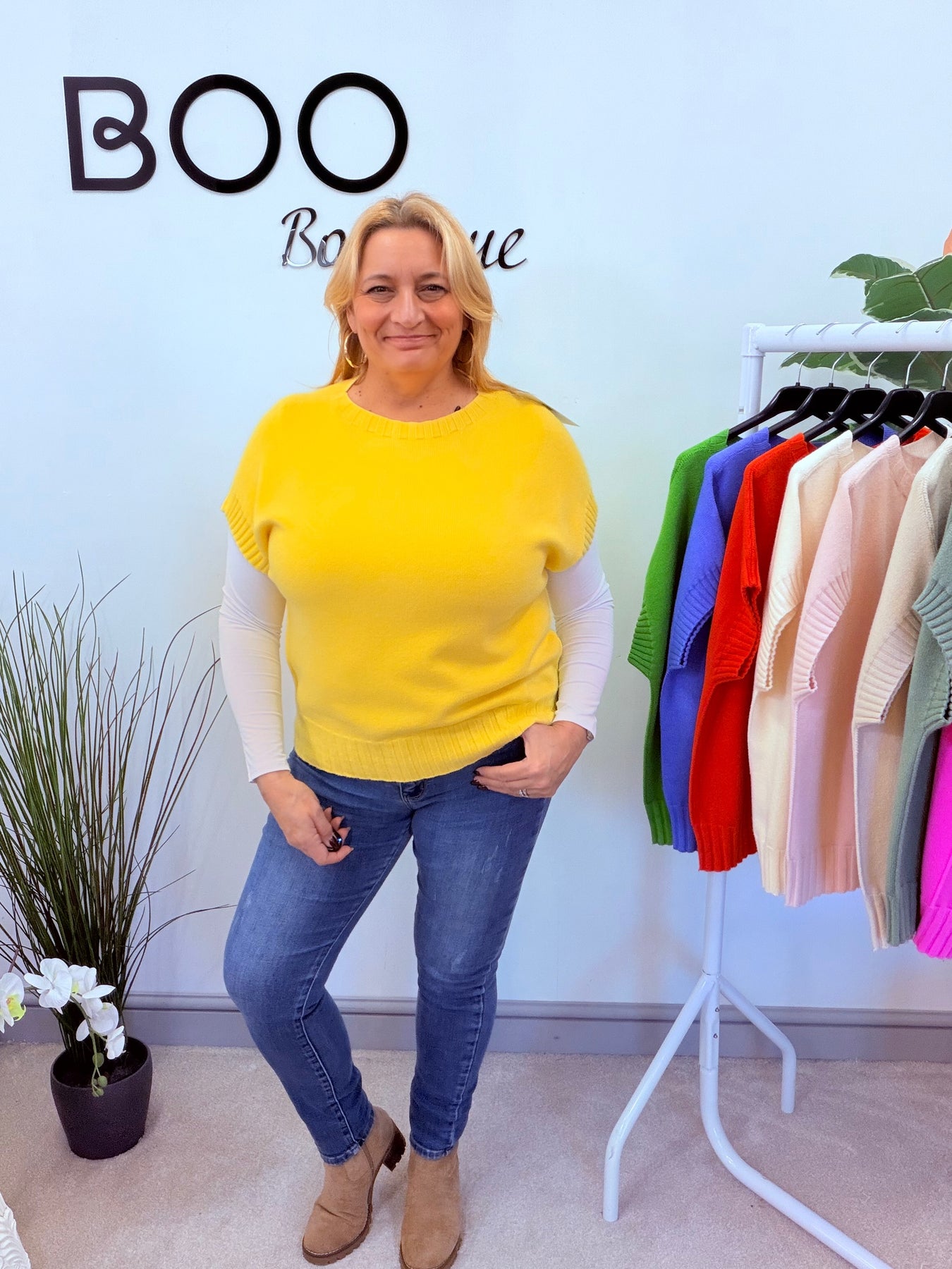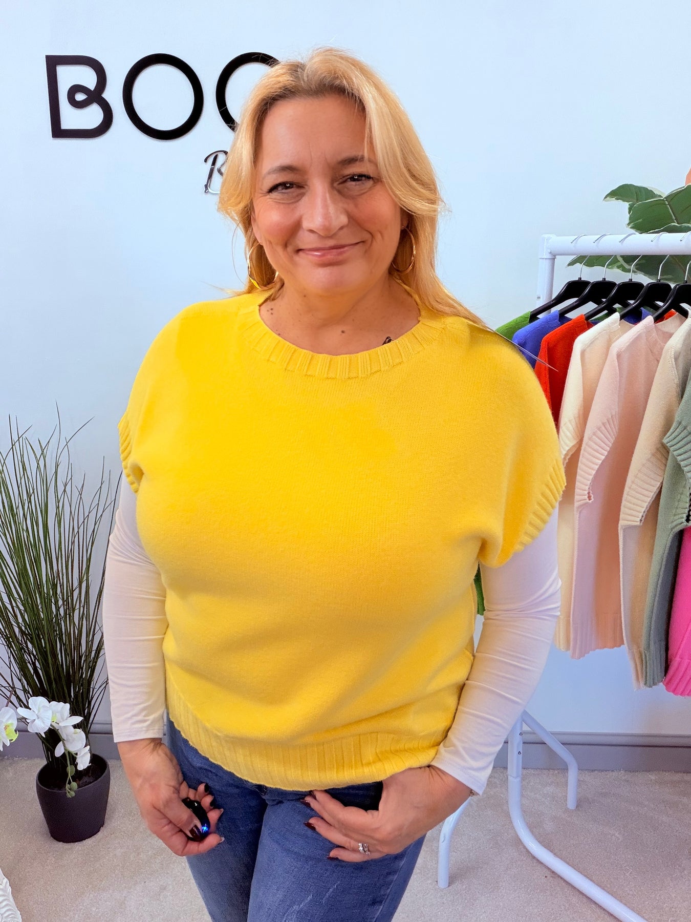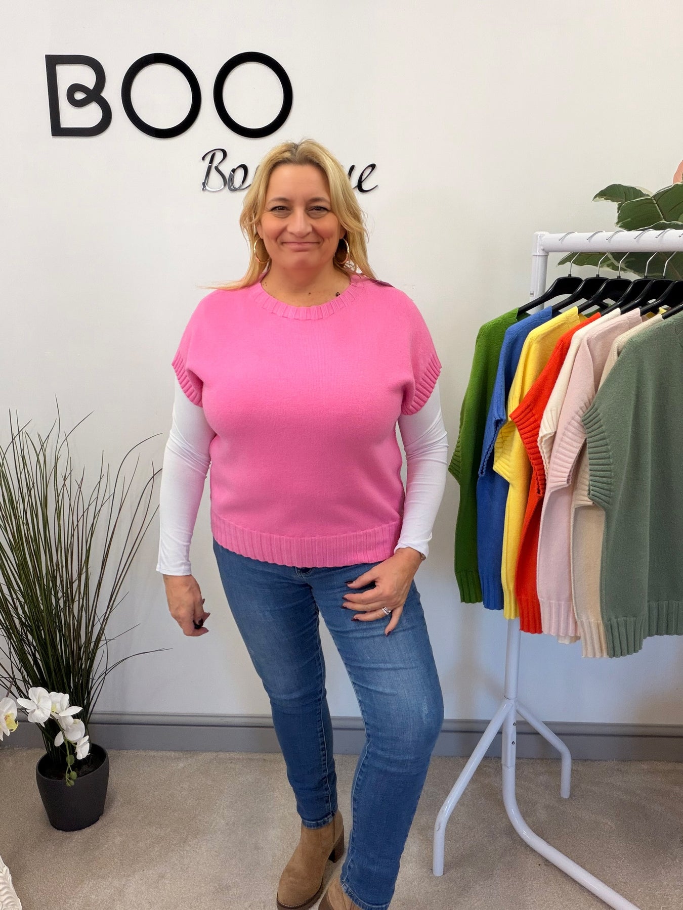 Introducing The TESS jumper - available in 9 stunning colours! Experience the luxurious softness of this ribbed sleeve tank top style jumper, perfect for layering over a long sleeve top or wearing on its own. One size fits UK sizes 8 to 16. Upgrade your wardrobe with this versatile and stylish piece.